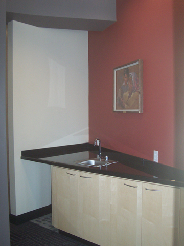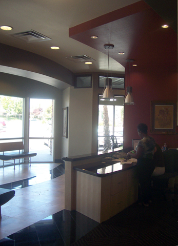 Through the use of line and shape, the space becomes very efficient. The curvilinear lines in the lobby, reception and conference areas not only break up the rectilinear feeling of the space, but mimiques the exterior overhang located in front of the entry. An earthy, desert color pallette is used throughout the space to bring depth, as well as show off the client's mother's artwork.