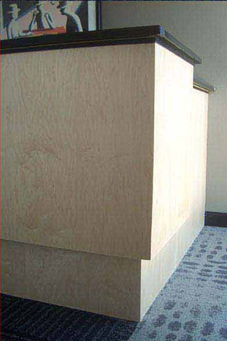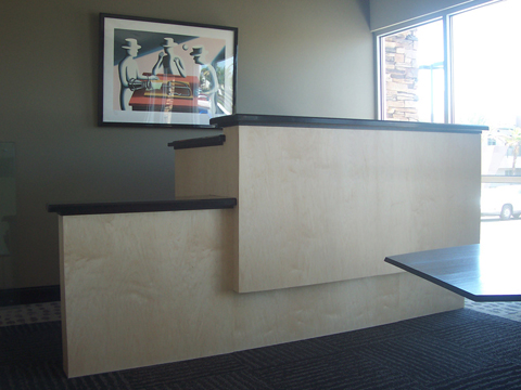 Work surfaces in the break area, work areas and stations are covered with durable plastic laminate.
